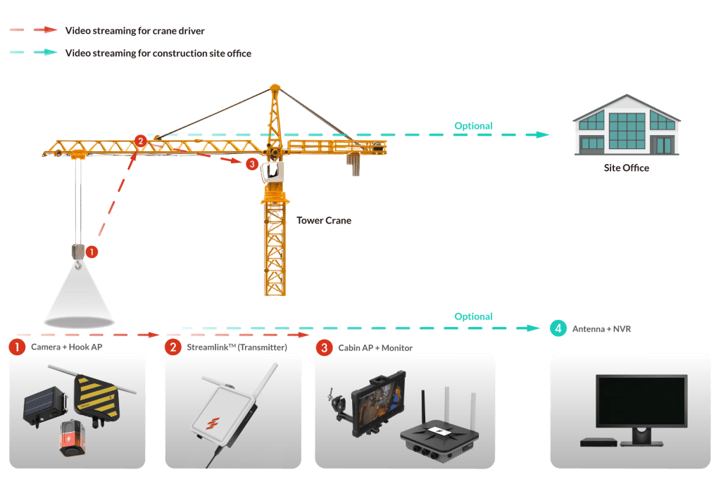 The whole system is an active safety technology that provides crane operators and safety managers with direct, 2K live video footage of the surrounding area below the hook and other viewpoints on the construction site, serving as a second pair of eyes for crane operators and construction site Health Safety and Environment managers to overcome blind spots and identify potential hazard zones.